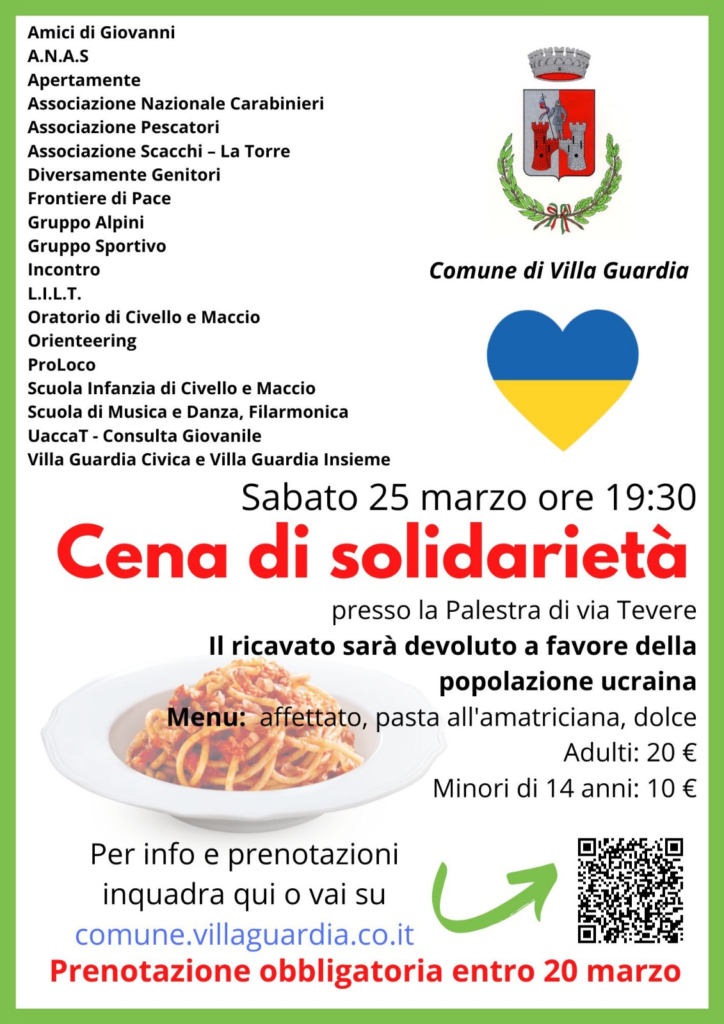 Schierati a sostegno dell’iniziativa, insieme al Comune, ci sono Amici di Giovanni, Anas, Apertamente, Associazione nazionale Carabinieri, Associazione Pescatori, Associazione Scacchi – La Torre, Diversamente Genitori, Frontiere di Pace, Gruppo Alpini, Gruppo sportivo Villa Guardia, Incontro, Lilt, oratori di Civello e di Maccio, Orienteering, Pro loco, scuole dell’infanzia di Civello e di Maccio, scuola di musica e danza, Filarmonica, Uacca T – Consulta giovanile, Villa Guardia Civica e Villa Guardia Insieme. Il menù della Cena di solidarietà, al costo di partecipazione di 20 euro per gli adulti e di 10 euro per i minori di 14 anni: affettato, pasta all’amatriciana e dolce. Prenotazioni entro lunedì 20 marzo cliccando l’indirizzo internet www.comune.villaguardia.co.it o inquadrando il Qr code della locandina dell’evento. Tutto il ricavato della cena sarà devuluto a favore della popolazione ucraina.
